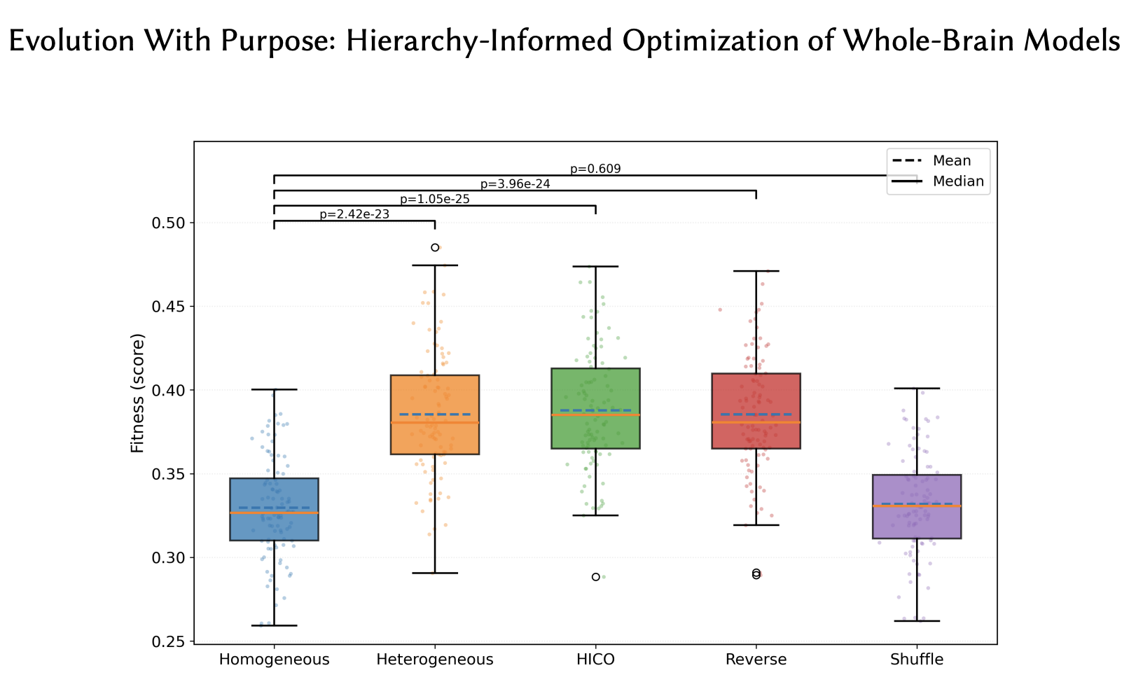 Evolutionary search is well suited for large-scale biophysical brain modeling, where many parameters with nonlinear interactions and no tractable gradients need to be optimized. Standard evolutionary approaches achieve an excellent fit to MRI data; however, among many possible such solutions, it finds ones that overfit to individual subjects and provide limited predictive power. This paper investigates whether guiding evolution with biological knowledge can help. Focusing on whole-brain Dynamic Mean Field (DMF) models, a baseline where 20 parameters were shared across the brain was compared against a heterogeneous formulation where different sets of 20 parameters were used for the seven canonical brain regions. The heterogeneous model was optimized using four strategies: optimizing all parameters at once, a curricular approach following the hierarchy of brain networks (HICO), a reversed curricular approach, and a randomly shuffled curricular approach. While all heterogeneous strategies fit the data well, only curricular approaches generalized to new subjects. Most importantly, only HICO made it possible to use the parameter sets to predict the subjects’ behavioral abilities as well. Thus, by guiding evolution with biological knowledge about the hierarchy of brain regions, HICO demonstrated how domain knowledge can be harnessed to serve the purpose of optimization in real-world domains.