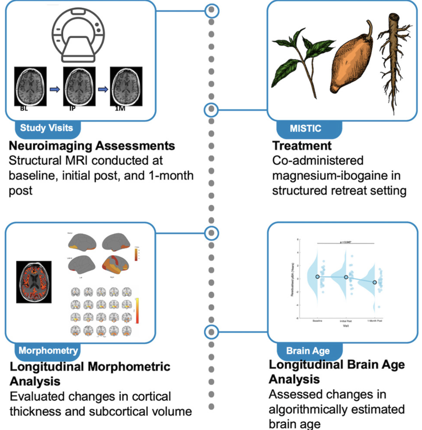 Methods: Thirty Special Operations Forces veterans with prior blast-induced TBI participated in an observational study in which they received ibogaine co-administered with magnesium. Structural MRIs were collected at baseline (n=25), initial post-treatment (n=25), and 1-month post (n=22). Longitudinal analyses assessed cortical thickness, subcortical volume, and predicted brain age (pBA); estimated from T1 scans.